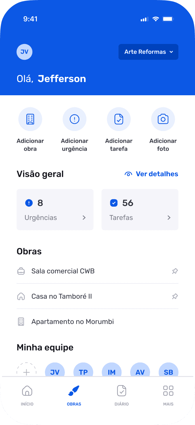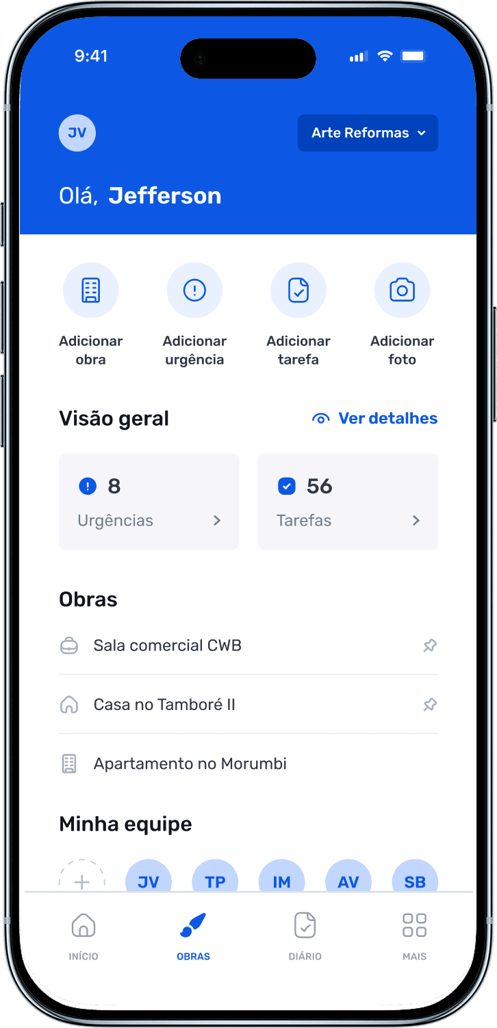 Centralize obras, tarefas pessoais, pendências por obra, lembretes, urgências, equipe e registros visuais em um só lugar.